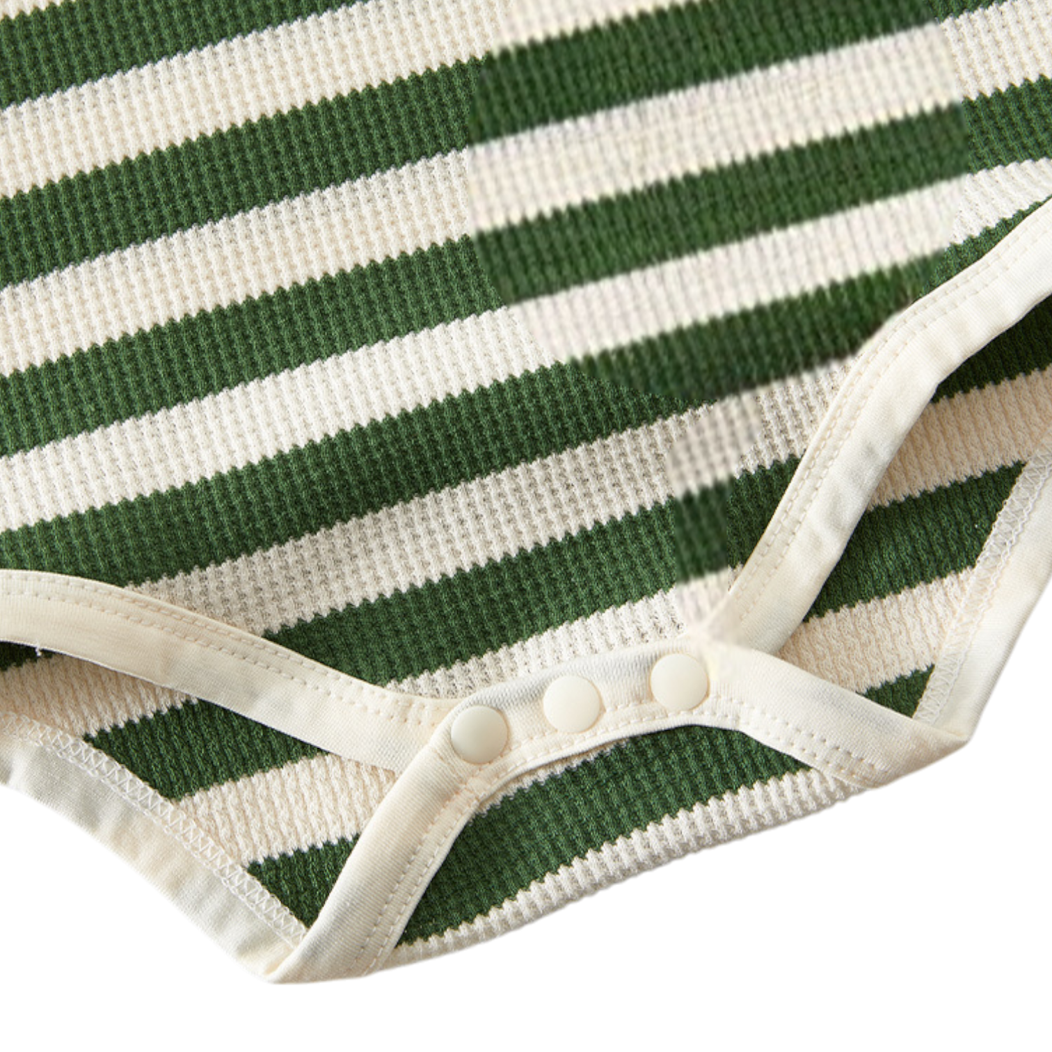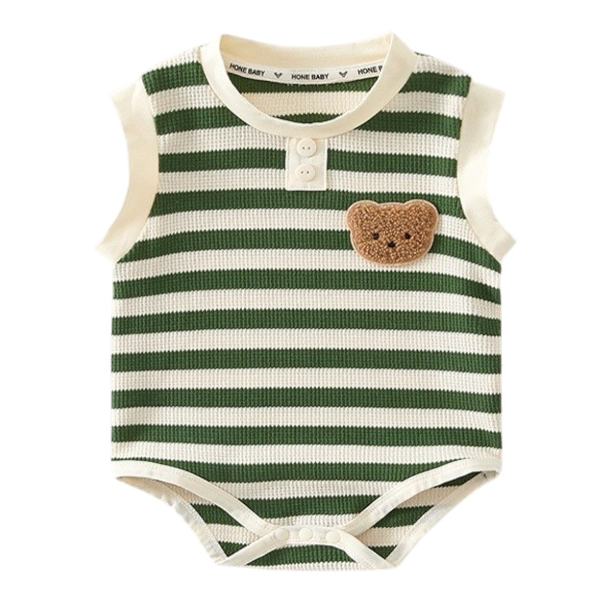 The Green Striped Sleeveless Baby Bodysuit features a fresh green stripe pattern in soft, breathable fabric. Designed without sleeves, it allows easy movement and keeps little ones comfortable during warmer weather — perfect for everyday wear, playtime, or outings.