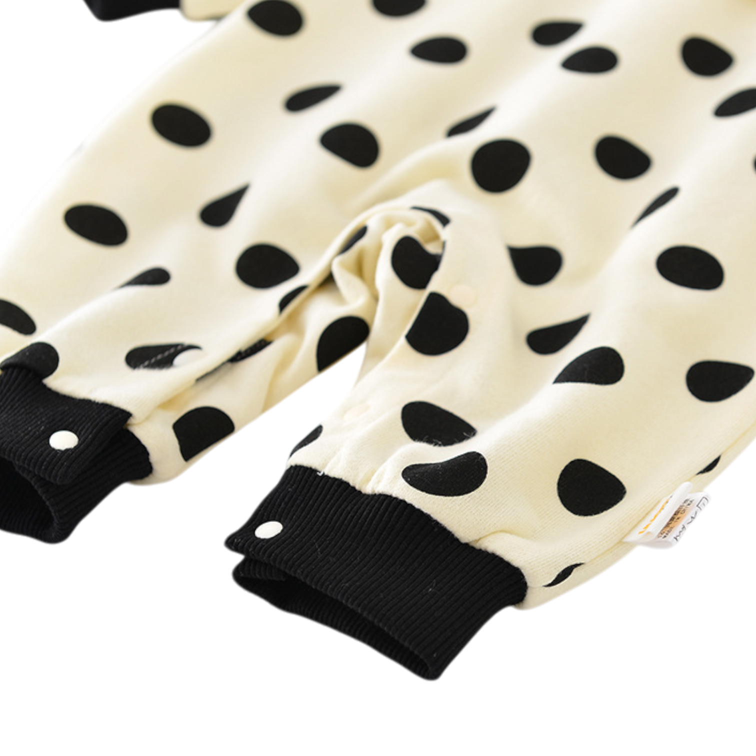 The Black & White Polka Dot Banana Winter Baby Romper features a fun banana motif combined with a classic black and white polka dot pattern. Made from warm, breathable fabric, it feels gentle on delicate baby skin — perfect for chilly days, playtime, or casual outings.